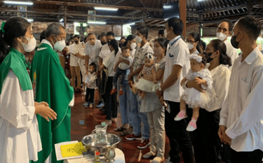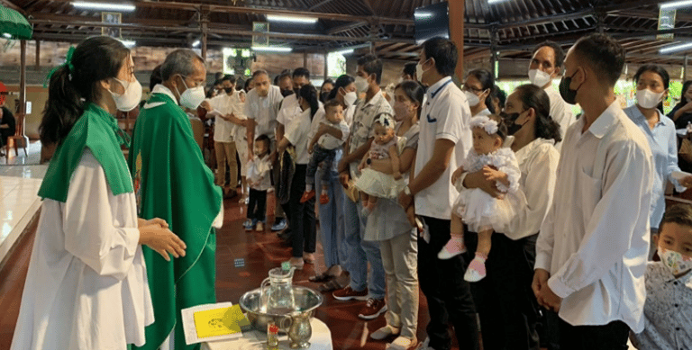 Romo Martin Fatin, menumpangkan tangan pada seluruh bayi dan anak-anak serta membaptis mereka dalam nama Bapa, dan Putera, dan Roh Kudus. Kelima belas bayi dan anak itu adalah