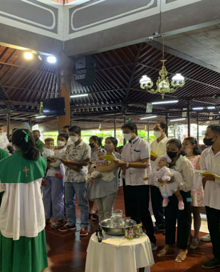Hari ini Minggu, 11 September 2022, suasana Gereja Paroki Tritunggal Mahakudus Tuka setelah misa ketiga agak berbeda. Orang tua dan saksi berkumpul menggendong bayi dan anak mereka dan duduk memenuhi bangku gereja. Minggu kedua dalam bulan, khususnya pada bulan September 2022 diadakan baptisan bayi dan anak. Lima belas orang bayi dan anak dibaptis pada hari ini. Jumlah baptisan terbesar sejak new normal diberlakukan. Jika dihitung dengan jumlah saksi dan orang tua yang hadir lajur tengah bangku gereja menjadi penuh. Ditambah lagi anggota keluarga lain yang turut hadir menyaksikan baptisan tersebut. Dalam homili singkatnya Romo Martin Fatin, SVD menegaskan kembali tentang kewajiban orang tua untuk mendampingi anak-anak dalam pembinaan iman mereka. Tugas orang tua tidak selesai pada saat membaptiskan putra putrinya saja, tetapi berkewajiban terus membina anakanak agar tumbuh dan berkembang dalam iman. Inilah yang harus disadari oleh para orang tua dan juga wali baptis.