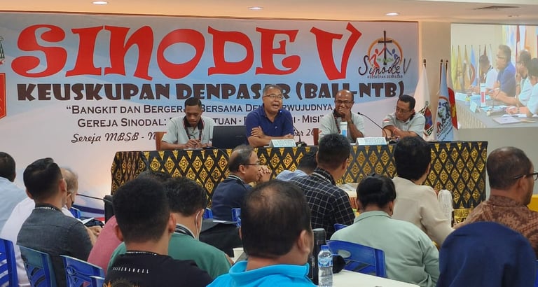 Setelah melalui pengarahan dari para narasumber yang datang dari luar Keuskupan Denpasar, dan juga berangkat dari hasil FGD Keuskupan, maka dihasilkan “Rumusan Akhir Sinode V Keuskupan Denpasar”. Pada bagian pertama, disampaikan pengantar yang mengingatkan kita sebagai warga gereja yang lahir karena Roh Kudus. Kita juga diingatkan bahwa Gereja harus menjadi berkat dalam dirinya sebagai Sakramen keselamatan. Oleh sebab itu sinode V ini menjadi momen yang tepat bagi seluruh anggota Gereja untuk bangkit dan bergerak bersama menuju Gereja Sinodal.